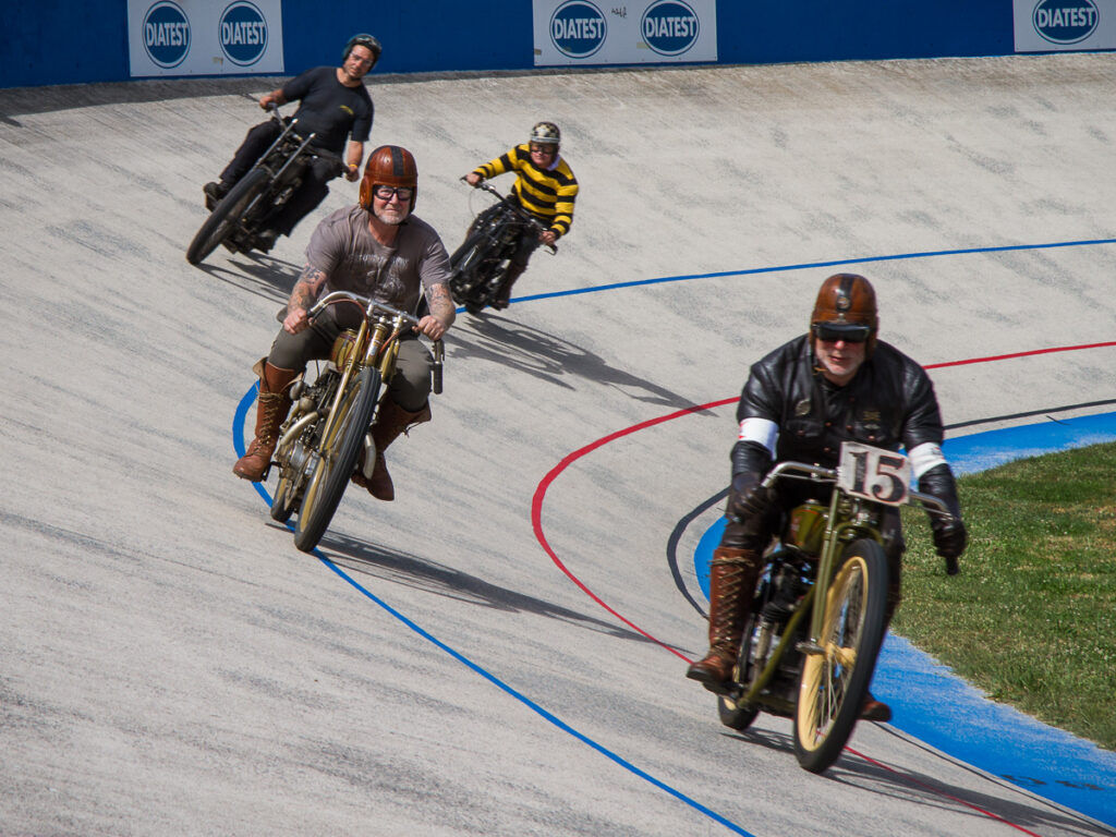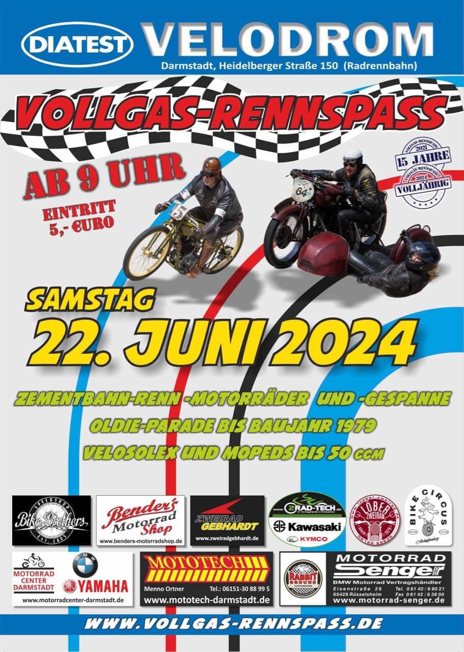 ″ Klassische Motorräder auf der Radrennbahn in Darmstadt Bessungen. Im Stil der Beton- und Holzbahnrennen (Board Track Racing) aus der Frühzeit des Motorradrennsports. Keine Zeitnahme - nur aus Spass an der Freude. Die Teilnahmegebühr beträgt EUR 20,-. Zugelassen sind Straßen- und Sport- bzw. Rennmotorräder (auch ohne Straßenzulassung) bis. Bj. 1979. Zuschauer zahlen nur EUR 5,- (Incl. Gehörschutzstopfen) Kinder und Jugendliche bis 16 Jahren frei. Alle weiteren Details folgen auf http://www.vollgas-rennspass.de ″