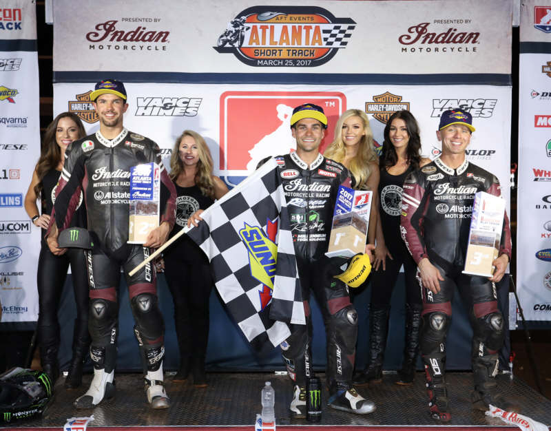 Der Dritte im Bunde, Brad Baker stürzte im ersten Lauf und konnte an diesem Tag nicht mehr an den Start gehen. Die Ärzte haben aber bereits grünes Licht für das nächste Rennen der Flat Track Meisterschaft 2017 gegeben, das schon am kommenden Samstag, dem 25. März im Dixie Speedway von Woodstock, Georgia stattfindet.